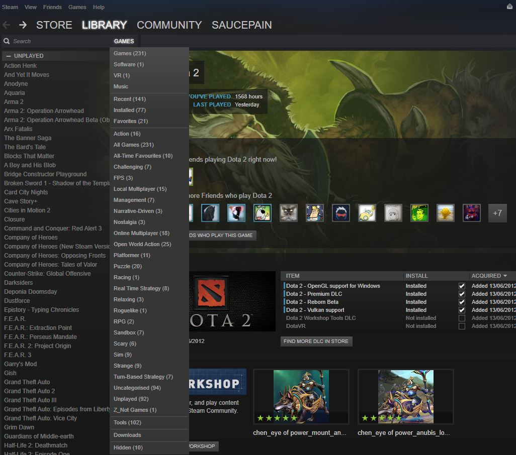 As well as the games I’ve anticipated and obsessed over, I have random one-offs that were on sale, games that were included in various bundles, and freebies. Some of the ones I got on sale have been played less than the ones I got for free. I’d go so far as to say that most of the games in my Steam library are unplayed (I then went and checked - not the majority, but a pretty hefty sum: 92 out of 231). This really only hit home recently, as I decided to reorganise the categories in the game library and found myself completely at a loss about certain games.