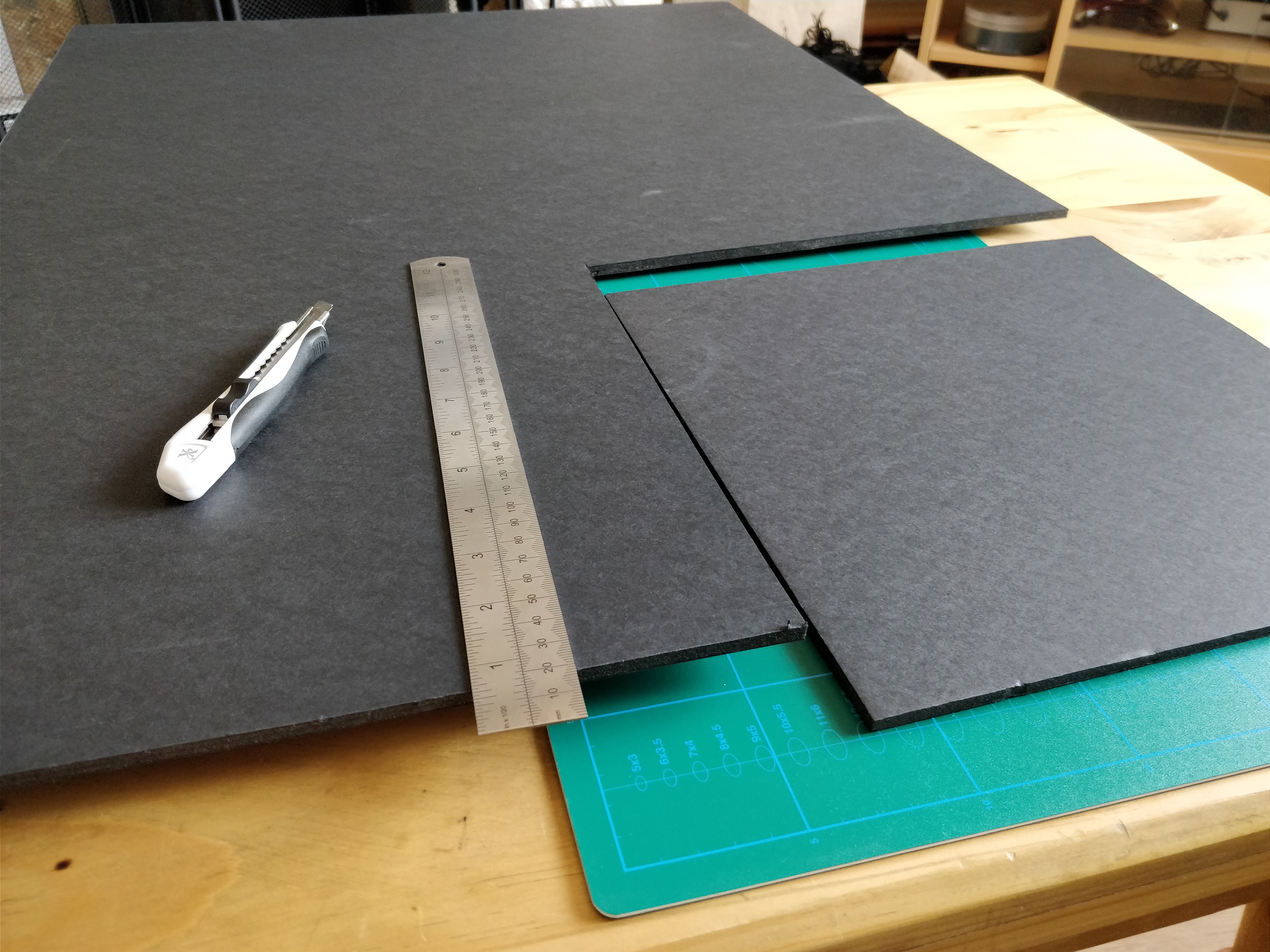 I picked up 3 A1 sheets of black 5mm foam board, a self-healing cutting mat, a cutting blade, and some glue and was ready to go. I couldn’t find anywhere selling dressmaker’s pins, so I liberated (and destroyed - sorry!) my girlfriend’s set.