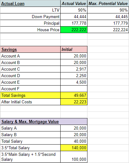 The linked mortgage spreadsheet has a calculator for maximum mortgage values if you want to play around with some numbers.