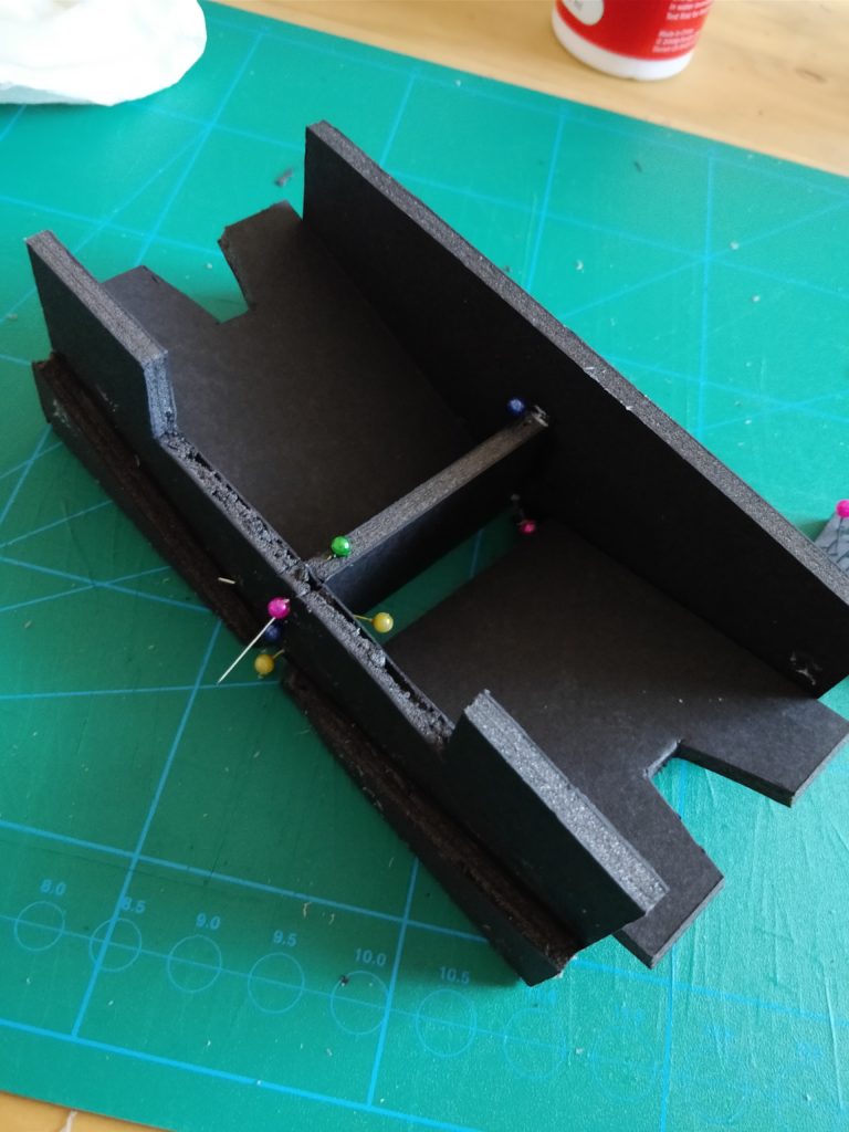 An in-progress shot before the floor goes on. You can see the notch I cut for the key card holder in the top and how it’s level with the walls of the adjoining sections for support. The whole thing is nice and solid with no wobble.