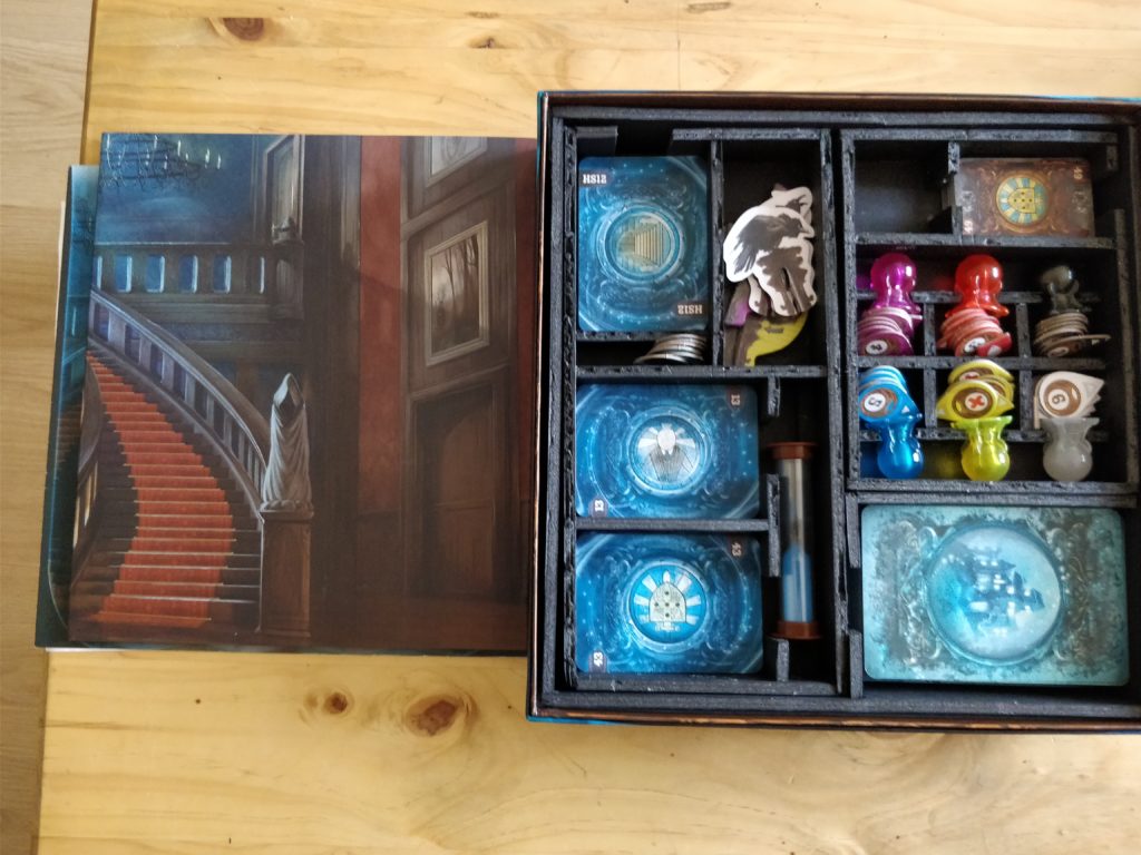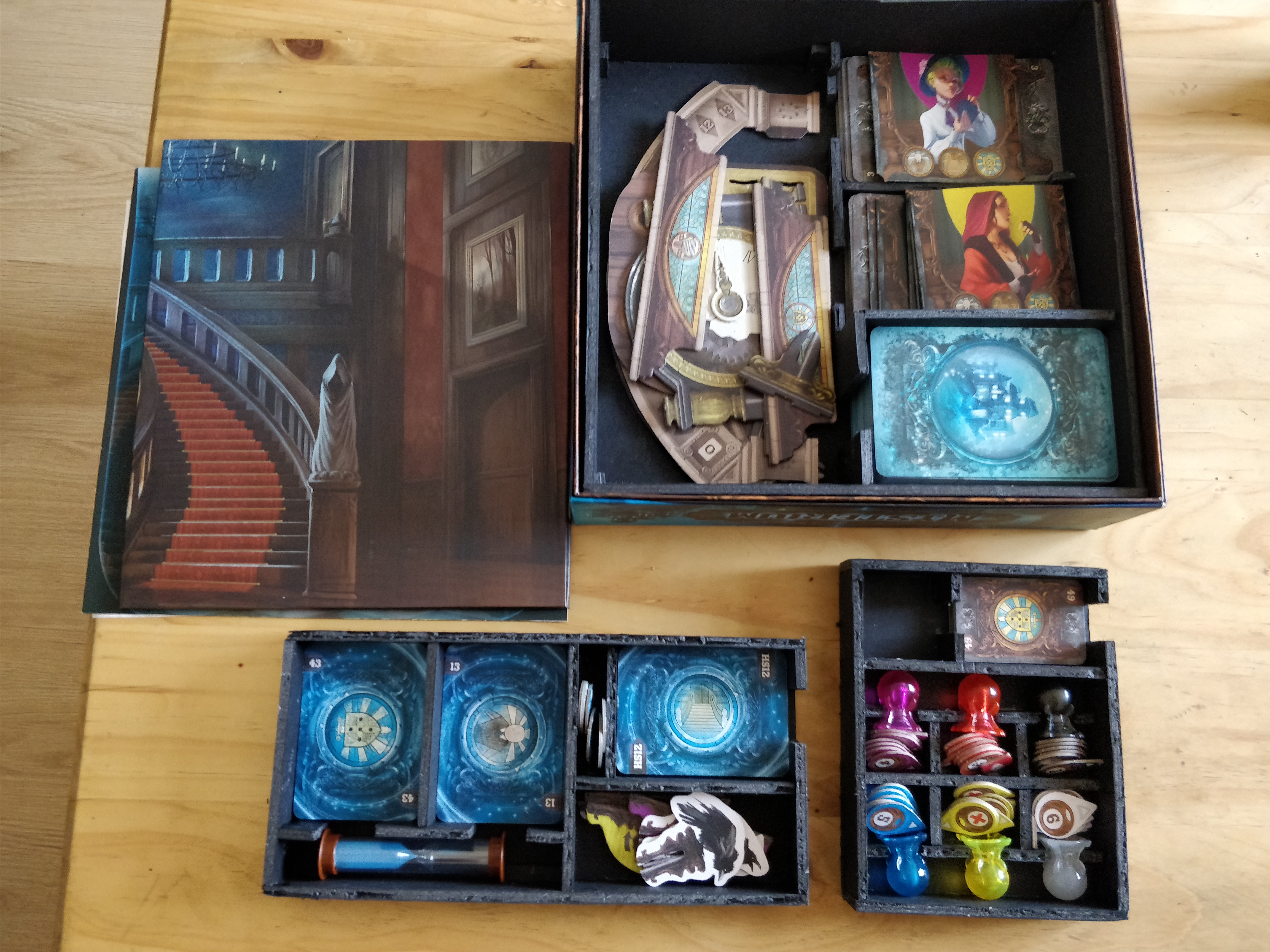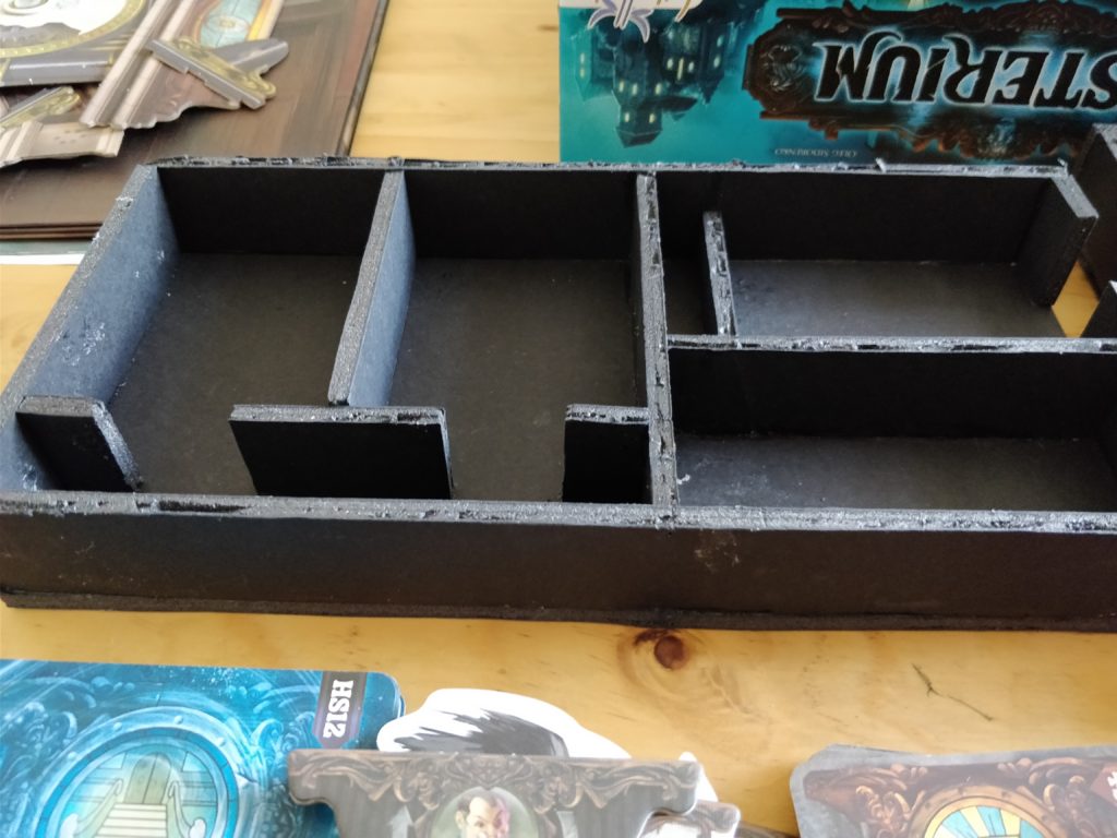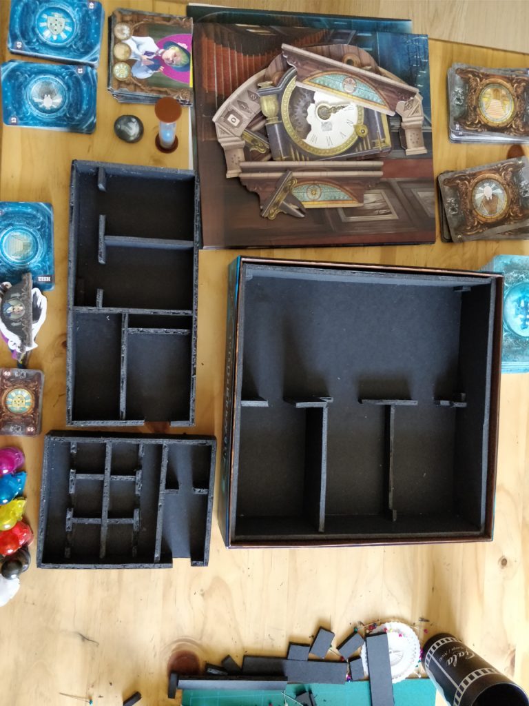 That said, it’s amazing functionally - no separation of decks, no sorting out of board pieces (they can all be dumped fairly unceremoniously in the designated section), and more time for ghostly shenanigans. I’m also pleased with how the trays fit into the box so nicely for a first attempt. I left a little bit too much space around the decks of cards in places though, which means that the cards can slide around a bit if the box gets shaken a lot while closed. I’d have been less generous with the height of the standoffs over the cards in the base of the box if I’d realised this would be an issue, but it’s a minor one.