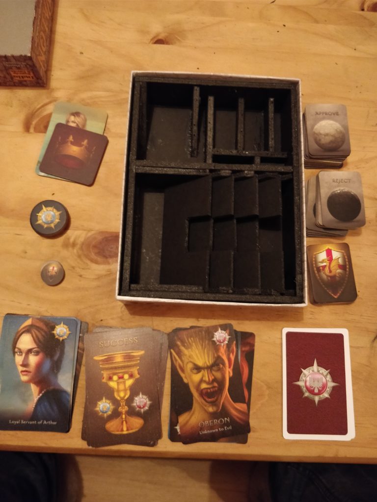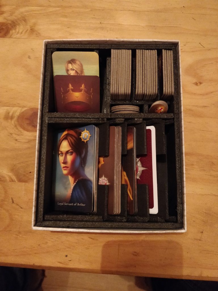 Inspiration from Mike Holzman over on Boardgamegeek, but I added the angled piece for the Lady of the Lake and Crown cards which allows them both to be seen at once. My core desire for this insert was that I wanted as many different components as possible to be visible at once to allow for easy grabbing.