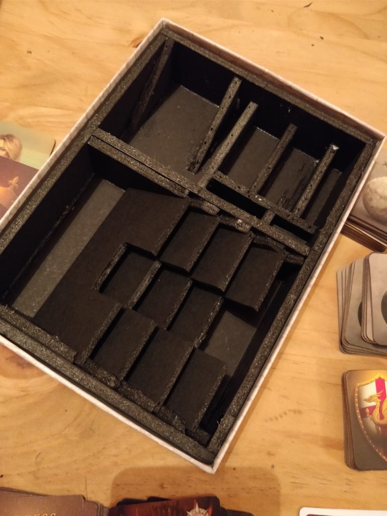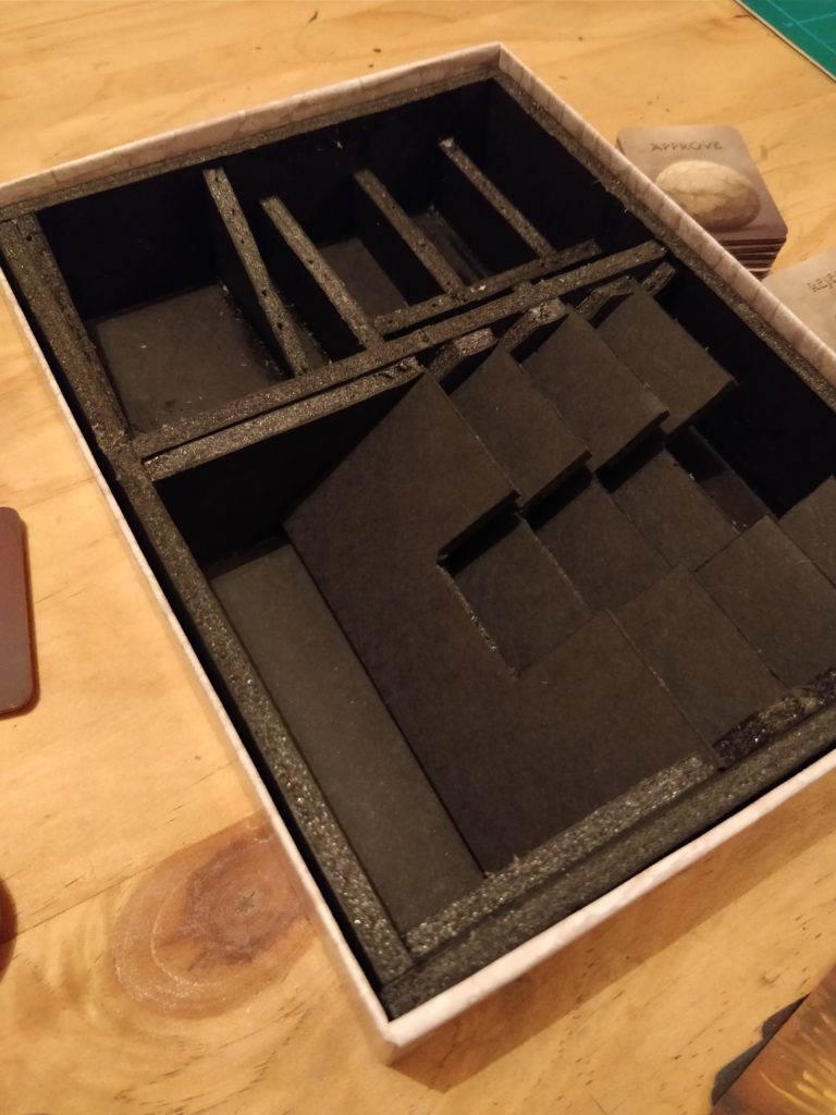 No in-progress shots of this one, unfortunately. I learned a lot of lessons from my Mysterium insert and I’m much happier with the finish on this one, though I do have some unfortunate glue spill-over around some of the joins. The big challenge with this insert was the angles for the separators for the big cards - major heartache getting those right!